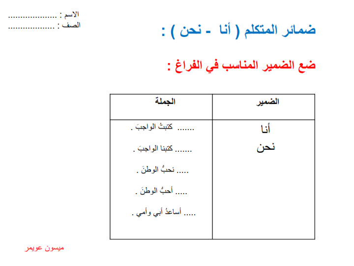 شرح الضمائر للصف الاول الابتدائي شيتات مراجعة و تدريبات